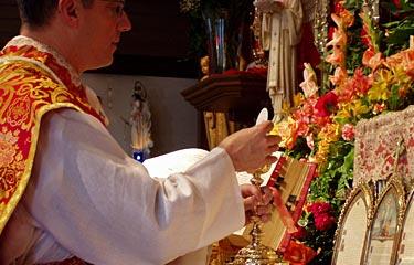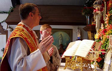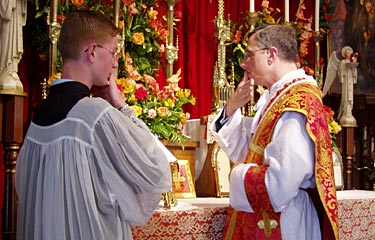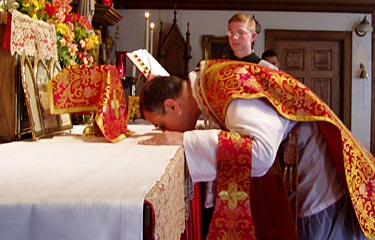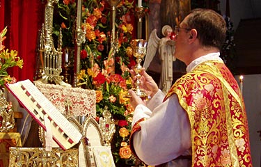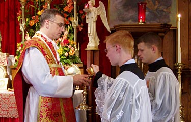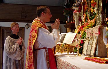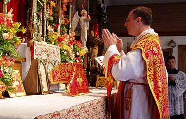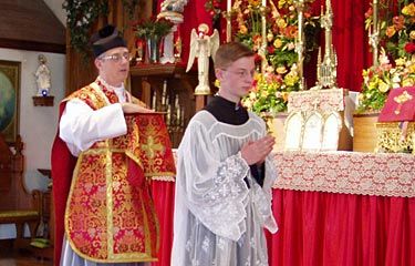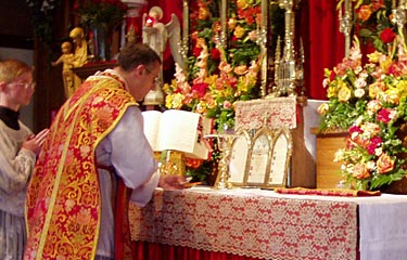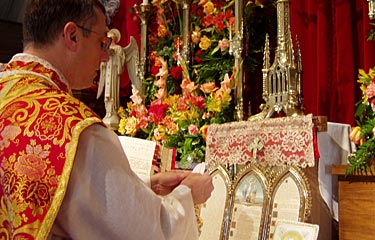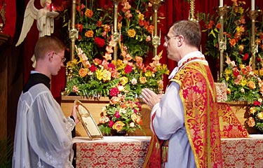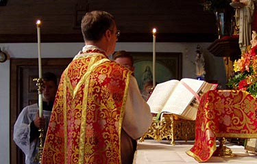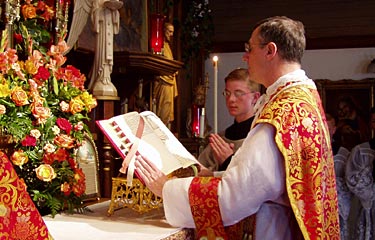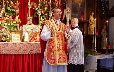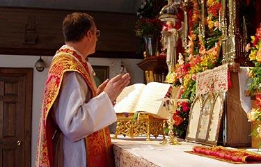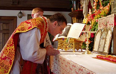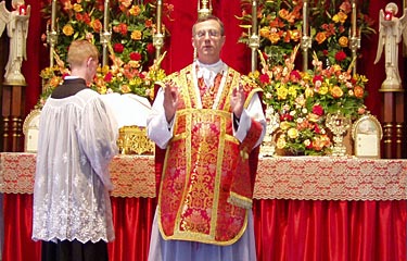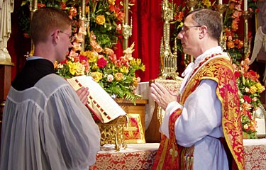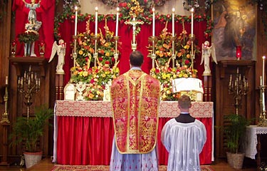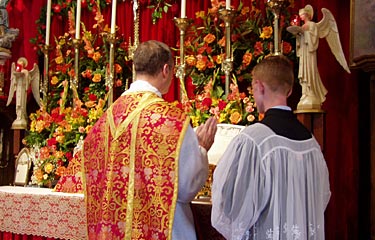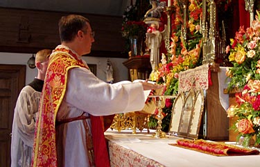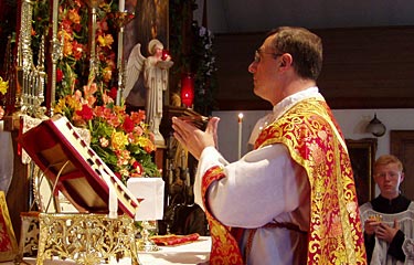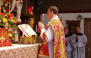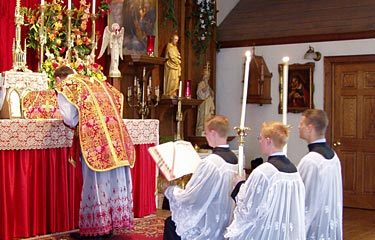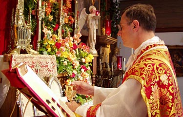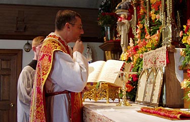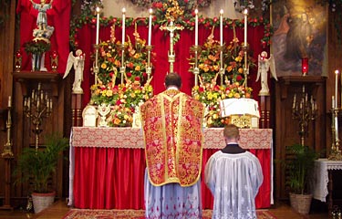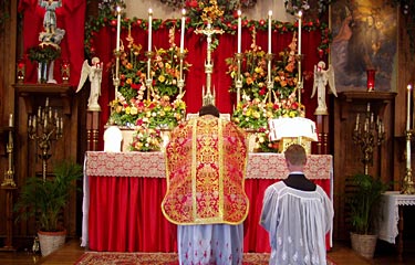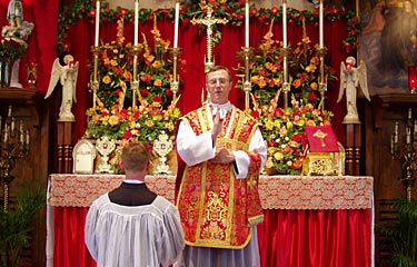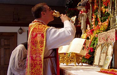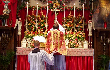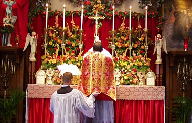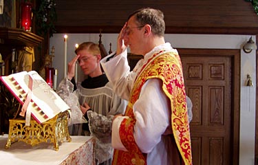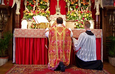 Before ascending to offer the Holy Sacrifice, the Priest stands at the foot of the Altar, and recites with the server the solemn words of Psalm 42, I will go in to the Altar of God, to God who giveth joy to my youth.Ever mindful of his unworthiness to offer the Body and Blood of our Lord Jesus Christ, the Priest makes a profound reverence, humbly asking God’s pardon in the Confiteor, I confess to almighty God.After the Absolutions, the Priest bows slightly and makes an appeal to God’s mercy before ascending to the Holy of Holies, Thou shalt turn again, O God, and quicken us, and thy people shall rejoice in thee.Kissing the relics of the holy Martyrs contained in the Altar, the Priest invokes their intercession and that of all the Saints, that God would vouchsafe to pardon me all my sins.Standing at the Epistle side of the Altar, the Priest makes the sign of the Cross and begins the Introit, which is taken from the Proper of the Mass of the Day.The Priest returns to the middle of the Altar, and after reciting the ninefold Kyrie Eleison invoking God’s mercy, offers praise and adoration to God in the Gloria in excelsis Deo.Turning to the congregation, the Priest greets them with the Dominus vobiscum, The Lord be with you, to which the server responds on behalf of the people, And with thy spirit.Returning to the Epistle side of the Altar, the Priest bows to the Holy Cross, saying Oremus, Let us pray, and then says the Collect, which is proper to the Mass of the Day.Often there is more than one Collect, asking for the intercession of other Saints commemorated today, or for a special intention.The Priest then reads the Epistle for the day, words taken from the letters and acts of St. Paul and the other Apostles, and which help us understand the special message of today’s holy Liturgy.The Priest bows profoundly at the middle of the Altar, asking God in the words of the Munda cor to be made worthy to announce the holy Gospel, Cleanse my heart and my lips, O almighty God.The Priest goes to the Gospel side of the Altar, making a triple sign of the Cross on his forehead, lips and heart, as he solemnly announces the Holy Gospel.As everyone in the Church stands and faces the Gospel, the Priest reads a passage from one of the four Evangelists, recounting an incident or parable from the life of our Saviour.As the Gospel ends, the server says Laus tibi, Christe, Praise be unto thee, O Christ. The Priest kisses the holy Gospel book and returns to the middle of the Altar.Facing the Altar, the Priest recites the Creed, which is the Church’s affirmation of faith in the divine mysteries. Recalling the Incarnation of God in the womb of the Blessed Virgin and the mystery of our Redemption, Priest and people fall to their knees at the words Et incarnatus est.The Offertory now begins. After a few short words proper to the Mass of the day, the Priest takes the wafer which is to be consecrated, and offers it to God that it may avail both him and all faithful Christians, living and dead, unto life everlasting.The Priest goes to the Epistle side and pours wine into the Chalice, adding a few drops of water to signify the union of God and Man in the person of our Lord Jesus Christ.The Priest offers the Chalice of salvation, imploring God’s clemency for the salvation of the whole world.After kissing the Altar, the Priest turns to the faithful, and asks for their prayers, Orate, fratres, Pray, brethren, that my sacrifice and yours may be well pleasing to God the almighty Father.After the Secret prayers, which are proper to the Mass of the day, the Priest recites aloud the most solemn words of the Preface, It is truly meet and just, right and profitable, for us, at all times and in all places, to give thanks to thee, O Lord, the Holy One, the Father almighty, the everlasting God.The Sanctus is said as the bells are rung three times for the Holy Trinity, Holy, holy, holy, Lord God of hosts. The Priest then bows and silently begins the Canon of the Mass.The Commemoration of the Living asks God to be mindful of all the faithful here present, their families and friends, that He might grant them the salvation of their souls and the health and welfare for which they hope.As the Priest extends his hands over the oblation, the bells are rung once to warn the faithful that the sacred Mystery is about to be enacted. The Priest prays that God will vouchsafe to bless, consecrate, and approve this our oblation.In a profound silence, the Priest says the holy words of Consecration, and changes the bread into the sacred Body of our Lord. The bells ring as he genuflects, and then again as he elevates the Sacred Host to allow the faithful to gaze upon their Lord. He genuflects once more and adores Christ present upon the Altar.The Priest continues the words of our Lord at the Last Supper, and consecrates the wine, which now becomes the Chalice of the Blood of Christ. Again he genuflects, raises the Chalice on high, and drops again to his knees in humble adoration.The Canon of the Mass now continues with the ancient prayers of our forefathers in the faith, invoking God’s blessings upon the holy Sacrifice, His mercy upon the faithful departed, and forgiveness for God’s people, sinners all. The Canon ends with the Minor Elevation, in praise of the Most Holy Trinity.The Priest now continues aloud with the prayer taught to us by our Saviour, the Pater Noster.Preparing now to receive the Sacred Body and Blood of Christ, the Priest asks to be delivered from all evil, past, present, and to come, begging the intercession of the Blessed Virgin and all the Saints for peace in our days.As he concludes this prayer, the Priest breaks the Sacred Host.The Priest makes the sign of the Cross with the Sacred Host over the Chalice, saying the Pax vobiscum, The peace of the Lord be always with you, and the server replies And with thy spirit.Bowing down, the Priest strikes his breast three times as a sign of contrition and humility, saying the 